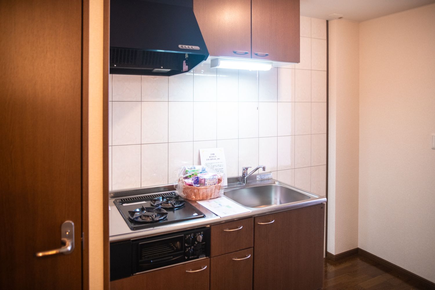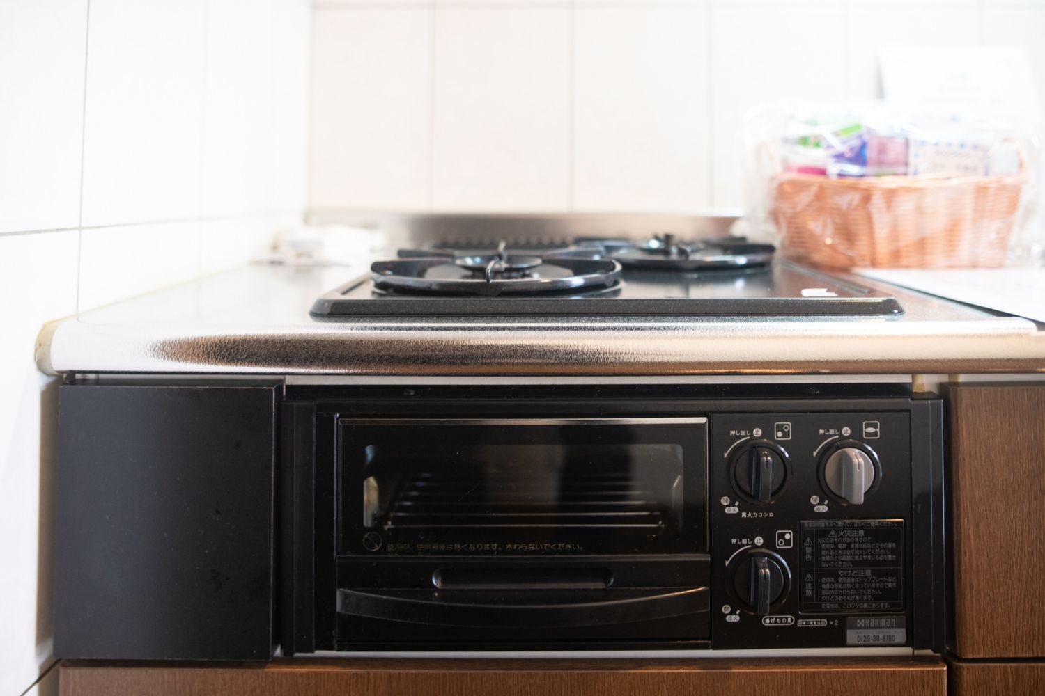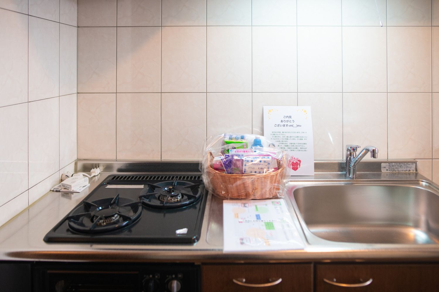 2口のガスコンロ、魚焼きグリル、混合水栓がある清潔なキッチンです。